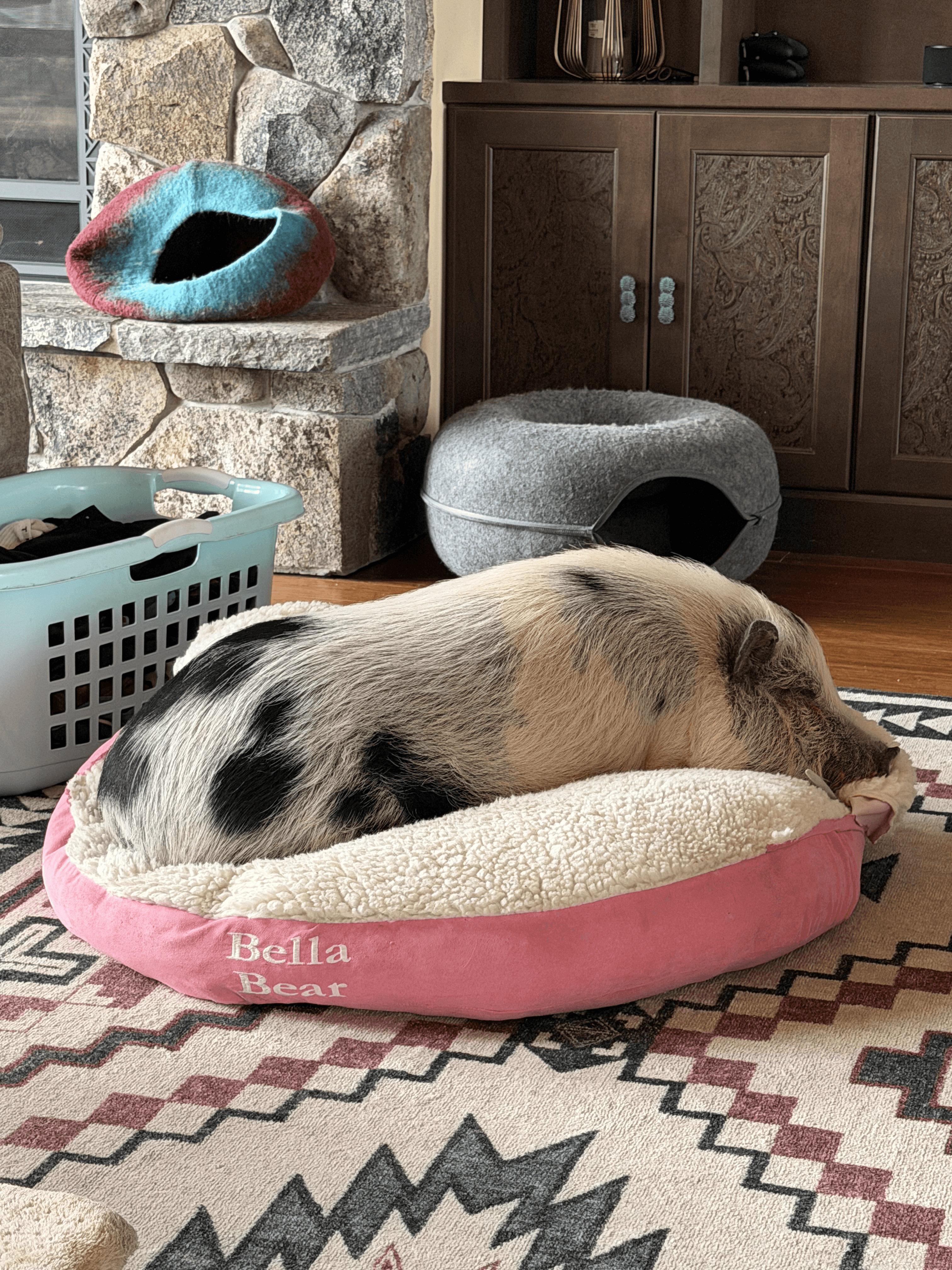 is her dog bed/blanket fort. She eats pig pellets, veggies, some fruit, and coconut flakes as a treat. Despite a well balanced diet, she can’t seem to resist the occasional duck and goose dropping.
