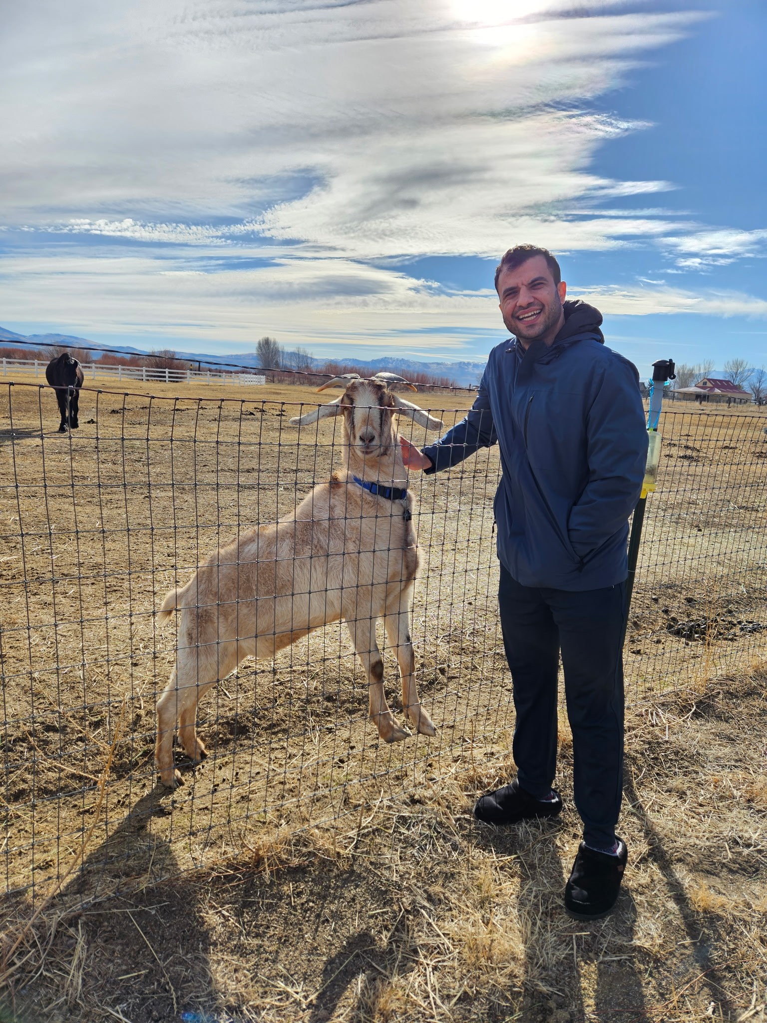 Despite waiting at the sliding glass door to be let in, Jeff likes hanging out with his sheep friends, eating anything he can find, and growing out lucious thick winter coat.